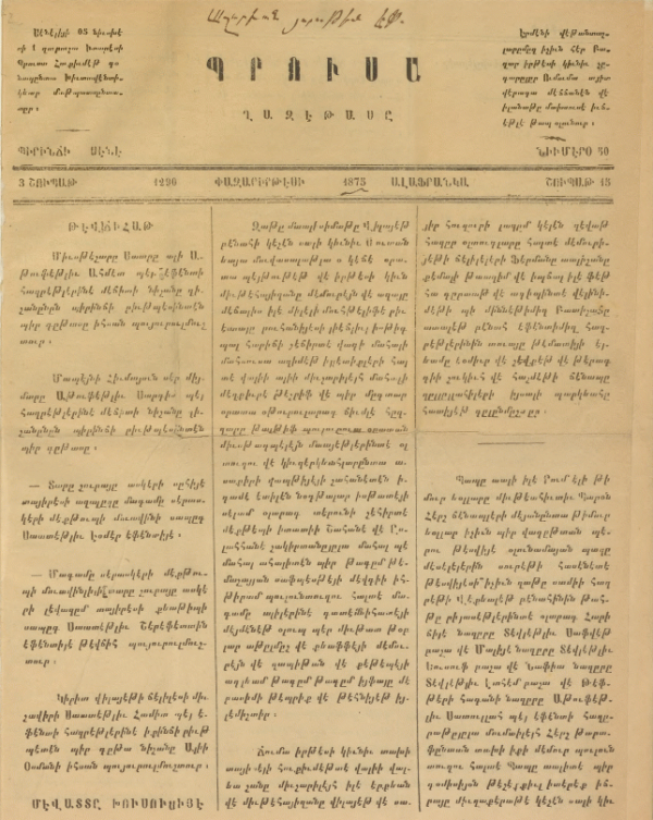 1875 թիւերը կազմուած եւ ամփոփուած են մէկ առանձին թղթածրարում. դասիչն է <b>Պ</b><br/><b>Վիեննական Մխիթարեան Մենաստանում</b> առկայ են : <br/>