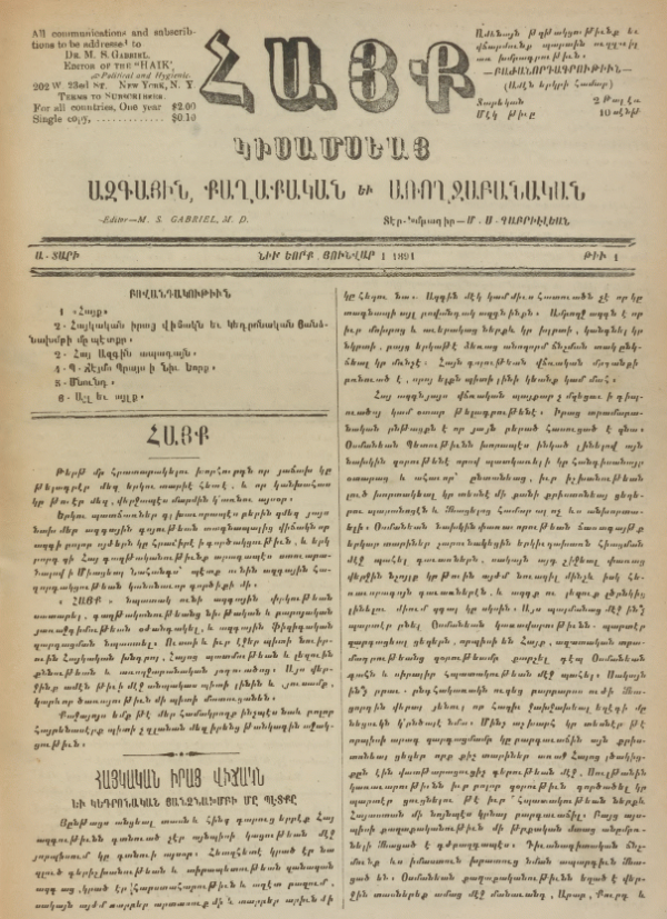 1891 Թիւ1: «Հայք» նպատակ ունի ազգային փրկութեան սատարել, գաղթականութեանց նիւթական և բարոյական յառաջդիմութեան օժանդակել, և ազգային ֆիզիգական զարգացման նպաստել: Ուստի և իւր էջեր պիտի նուիրուին Հայկական խնդրոյ, Հայոց պատմութեան և լեզուին քննութեան և առողջաբանական յօդուածոյ»։