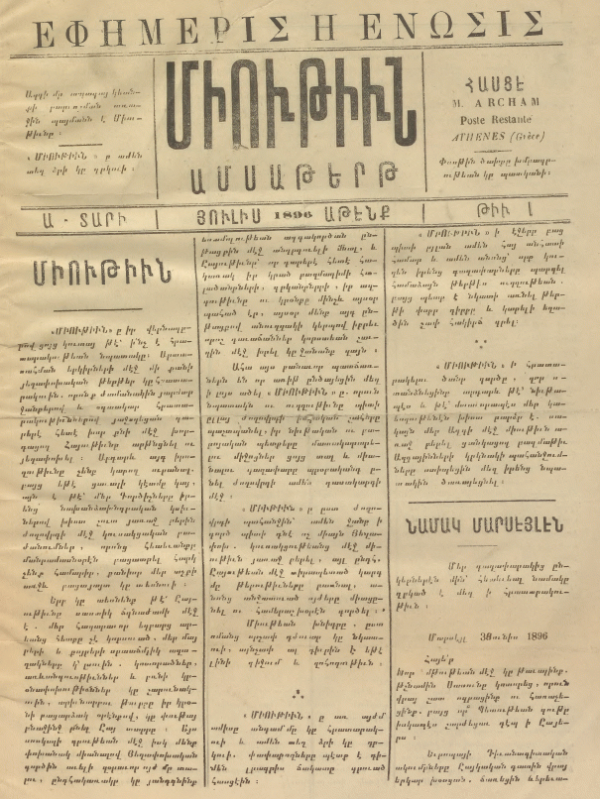 1896, Ա․ Տարի - ՄԻՈՒԹԻՒՆ ։ Ամսաթերթ։</br>