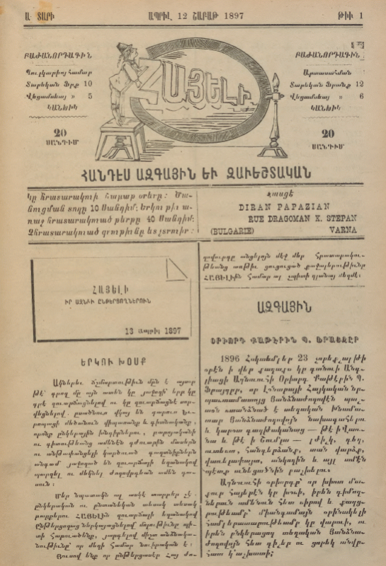 ՀԱՅԵԼԻ : Հանդէս Ազգային եւ Զաւեշտական / Տնօրէն-Խմբ.՝ Տիրան Փափազեան; Խմբ.՝ Никола Драгулевъ, Խմբ.՝ М. Сконовъ, Խմբ.՝ Ж. Ив. Жековъ, Խմբ.՝ Георги Янтовский.